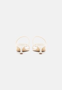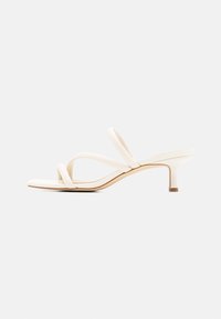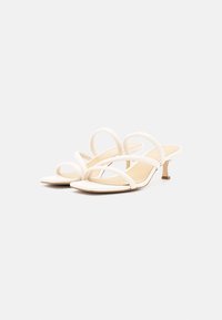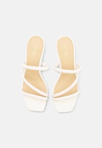 Sandales blanches à talons avec deux brides croisées. Elles présentent un talon bas et cylindrique ainsi qu'une surface lisse et mate au design minimaliste.