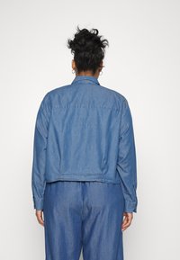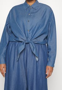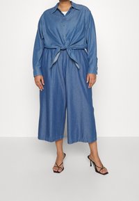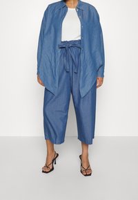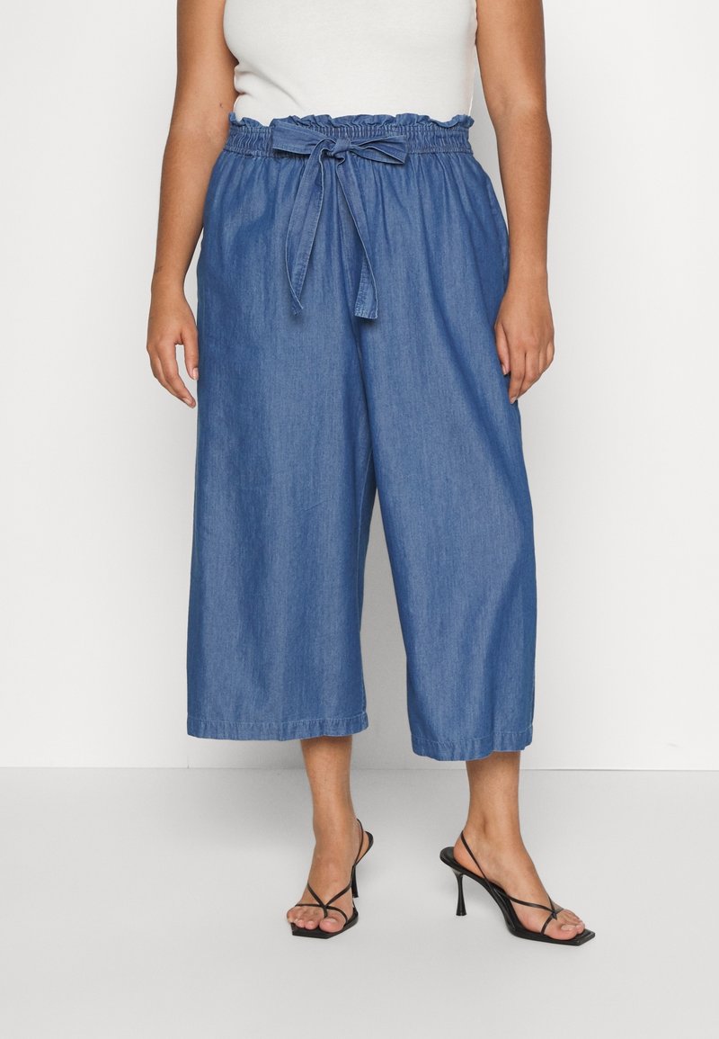 Culottes en denim avec une taille élastiquée froncée et une ceinture en tissu, présentant une coupe décontractée et un ourlet à la cheville, dans une teinte bleu moyen.