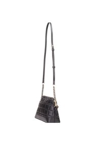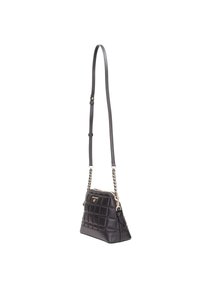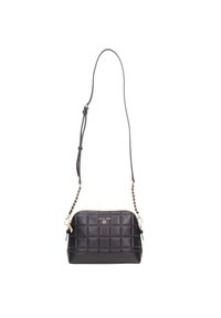 Sac à main en cuir matelassé noir avec fermeture éclair, chaîne et strap en cuir, forme rectangulaire et accents en métal doré.