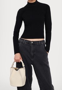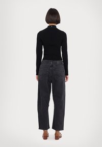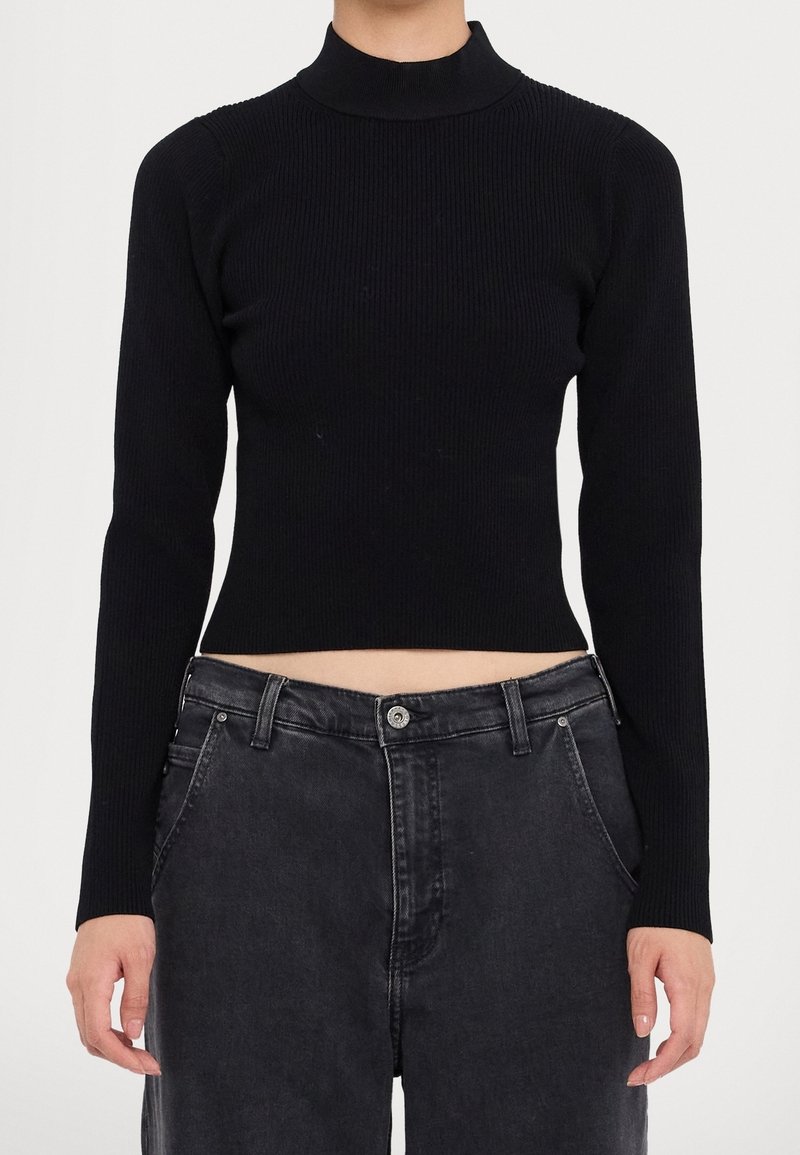 Pull à col roulé court à manches longues côtelé noir associé à un jean noir délavé taille haute porté par une personne.