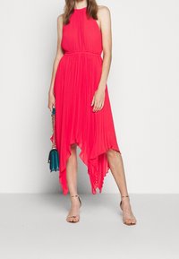 Robe halter fuchsia en tissu plissé, avec un ourlet asymétrique et une taille cintrée. Associée à des sandales à talons métalliques.