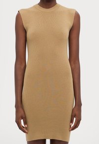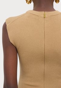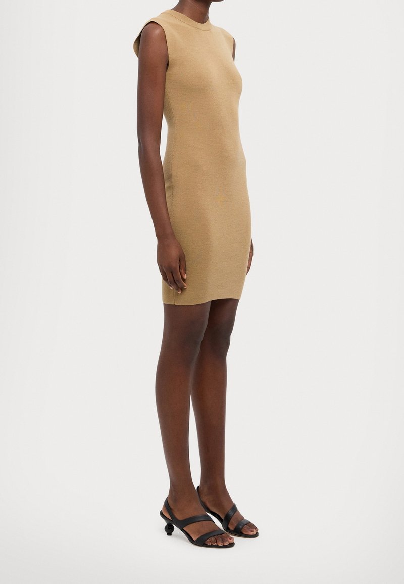 Robe ajustée sans manches en tissu maille beige avec un col rond. Associée à des sandales noires à lanières avec un talon arrondi.