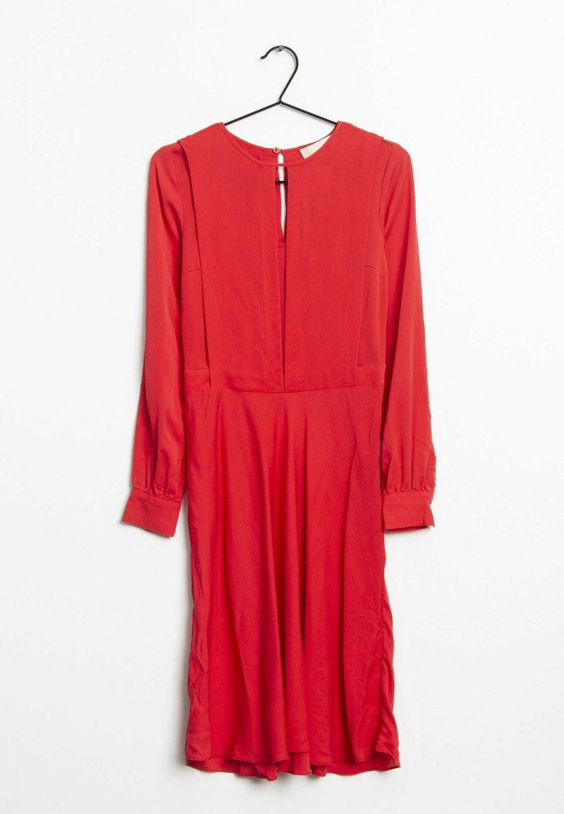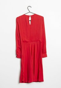 Robe rouge à manches longues, encolure ronde et détail dos avec ouverture en forme de goutte. Tissu doux qui tombe délicatement jusqu'aux genoux, avec poches latérales.
