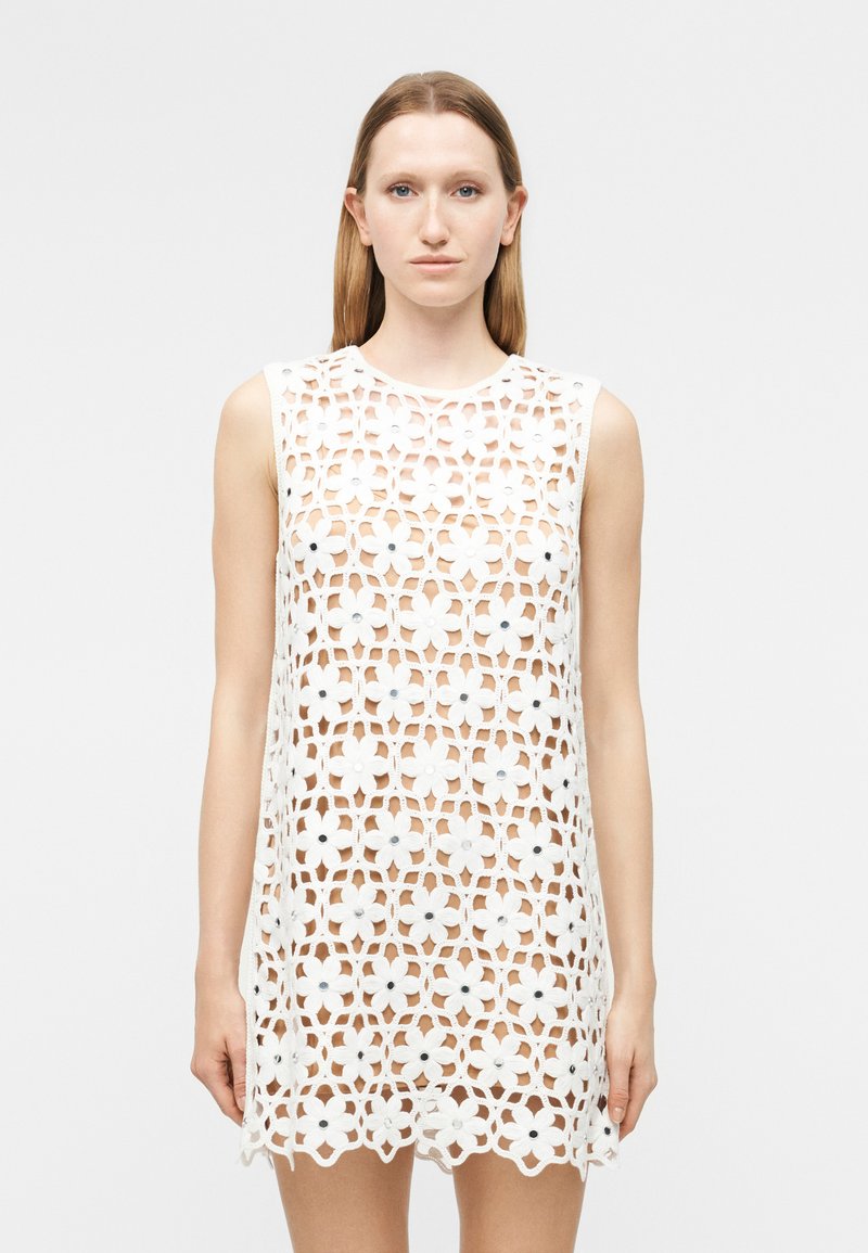Femme portant une robe blanche en crochet sans manches avec des motifs floraux, debout devant un fond clair uni, face à l'avant.