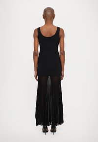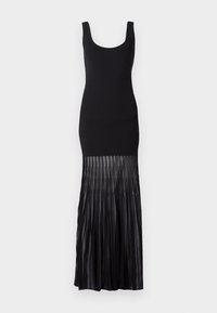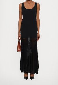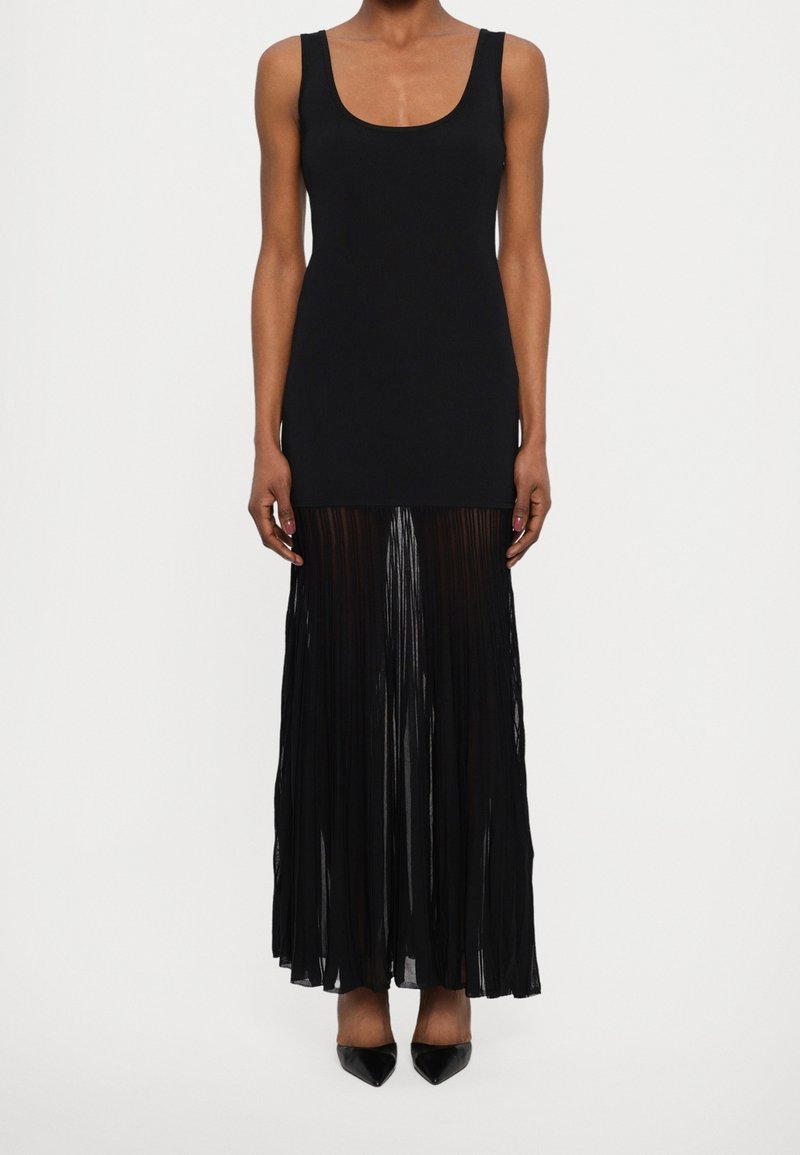 Robe noire avec un haut ajusté et une jupe maxi plissée. Le tissu semble lisse et léger, avec une longueur jusqu'aux chevilles et sans motifs visibles.