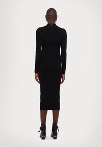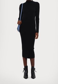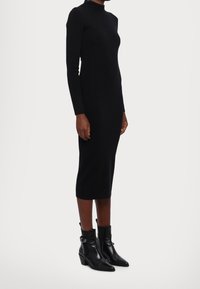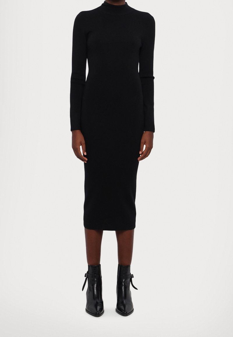 Femme portant une robe midi noire ajustée à manches longues, associée à des bottines noires à bout pointu sur un fond blanc.