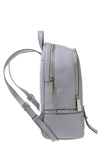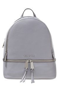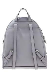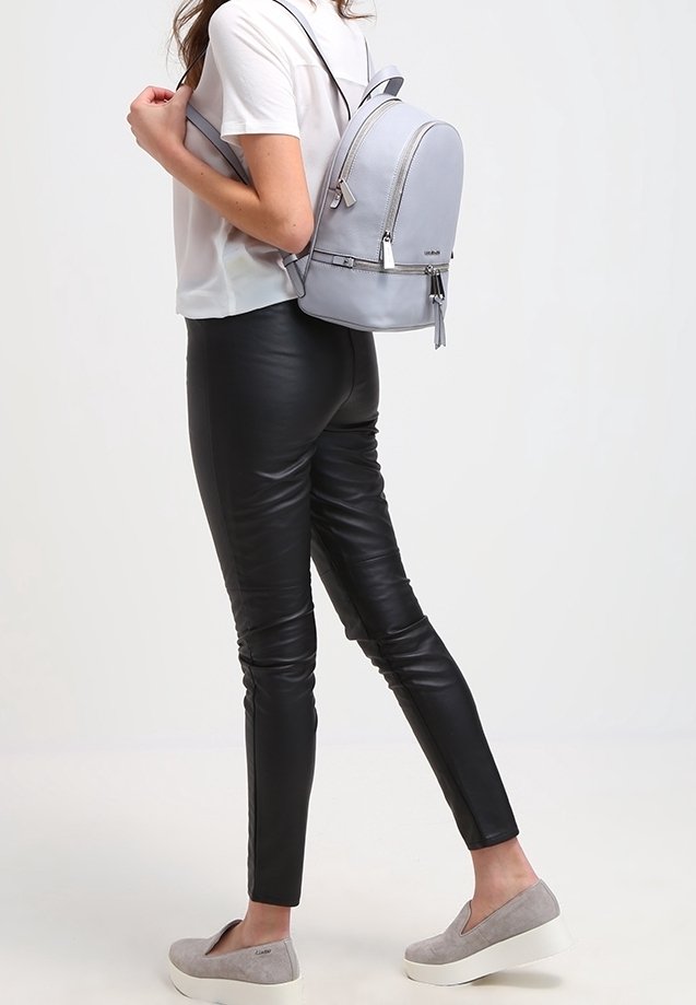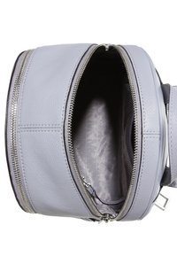 Sac à dos en cuir gris clair à forme arrondie, avec une poche avant zippée et des bretelles réglables, porté avec un haut blanc et un pantalon noir ajusté.