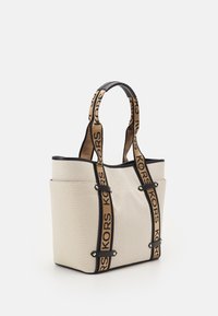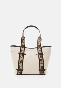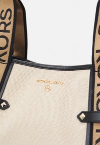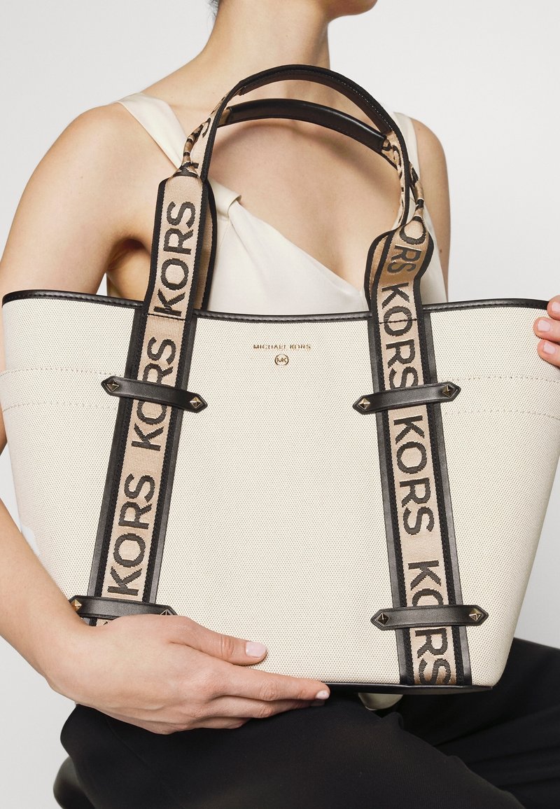 Femme tenant un grand sac cabas beige Michael Kors avec des bordures noires et de larges anses d'épaule à logo.
