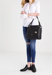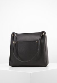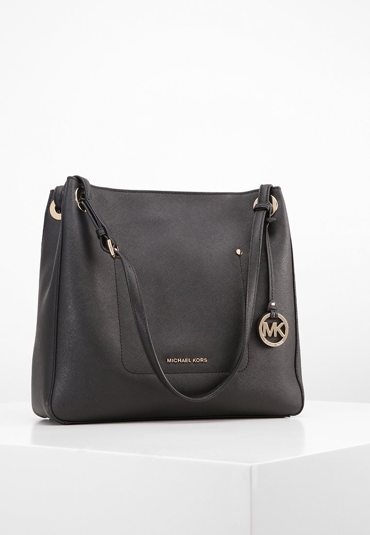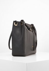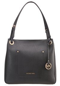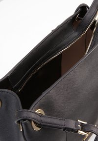 Sac à main en cuir noir au design structuré, doté de quincaillerie dorée, d'un accent de logo circulaire et d'une seule bandoulière.
