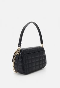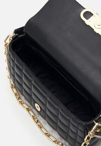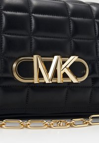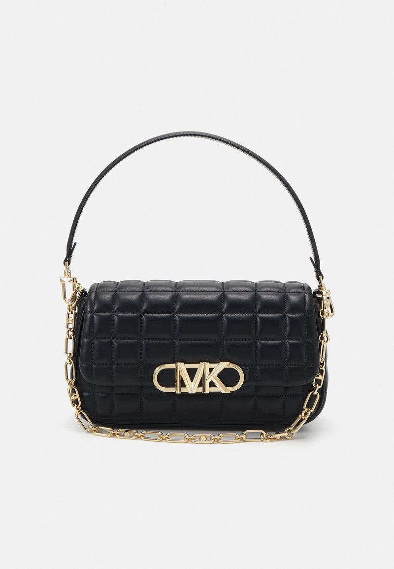 Sac à main en cuir matelassé noir avec un logo MK doré, deux options de transport avec une chaîne et une bandoulière en cuir, et une forme rectangulaire structurée.