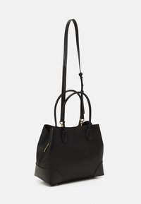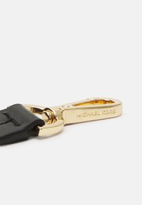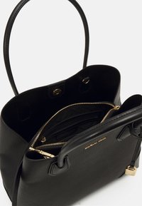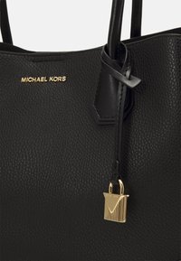 Sac à main noir Michael Kors avec deux poignées, une bandoulière détachable et un petit charm en forme de cadenas doré à l'avant.