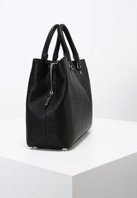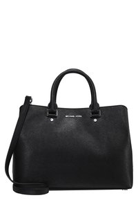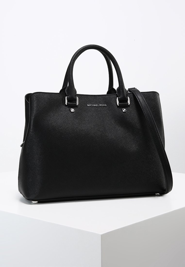 Sac à main noir Michael Kors avec deux poignées et une longue bandoulière, cuir texturé et ferrures ton argent sur une surface blanche.