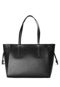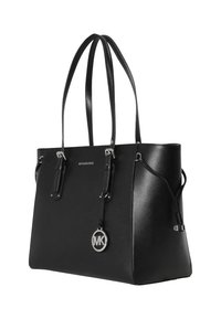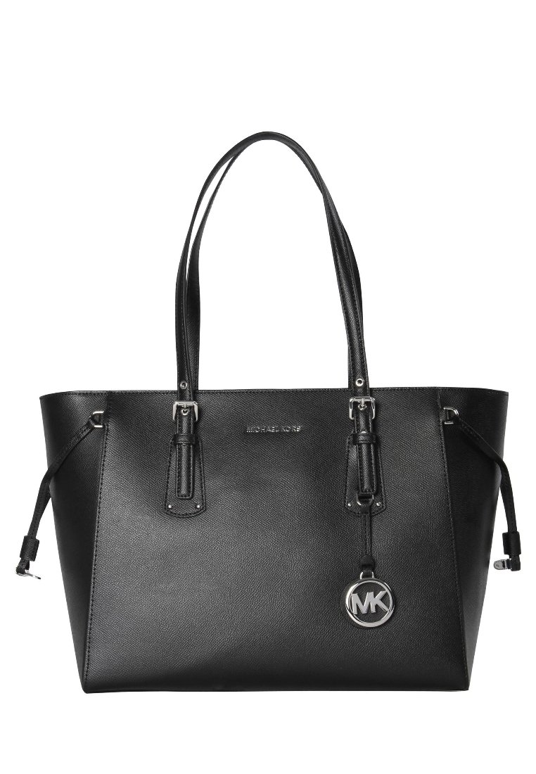 Sac cabas noir Michael Kors en cuir avec double anse d'épaule, pendentif logo argenté et détails de cordon latéraux.