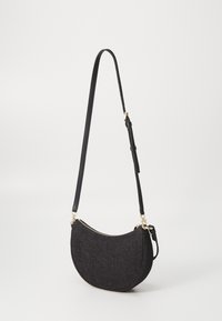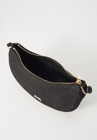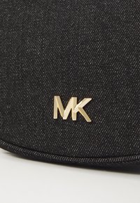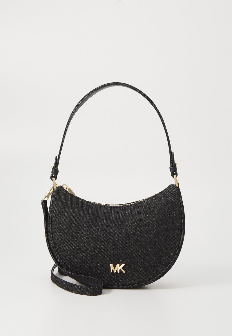 Sac à main croissant texturé noir avec logo MK doré, une poignée supérieure unique et une bandoulière réglable sur un fond clair uni.