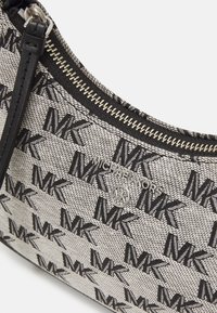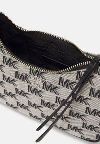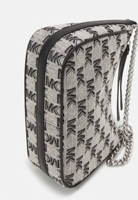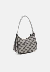 Petit sac à main Michael Kors gris et noir avec motif répété du logo MK et poignée chaîne argentée.