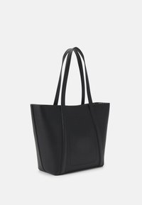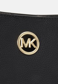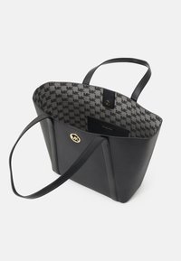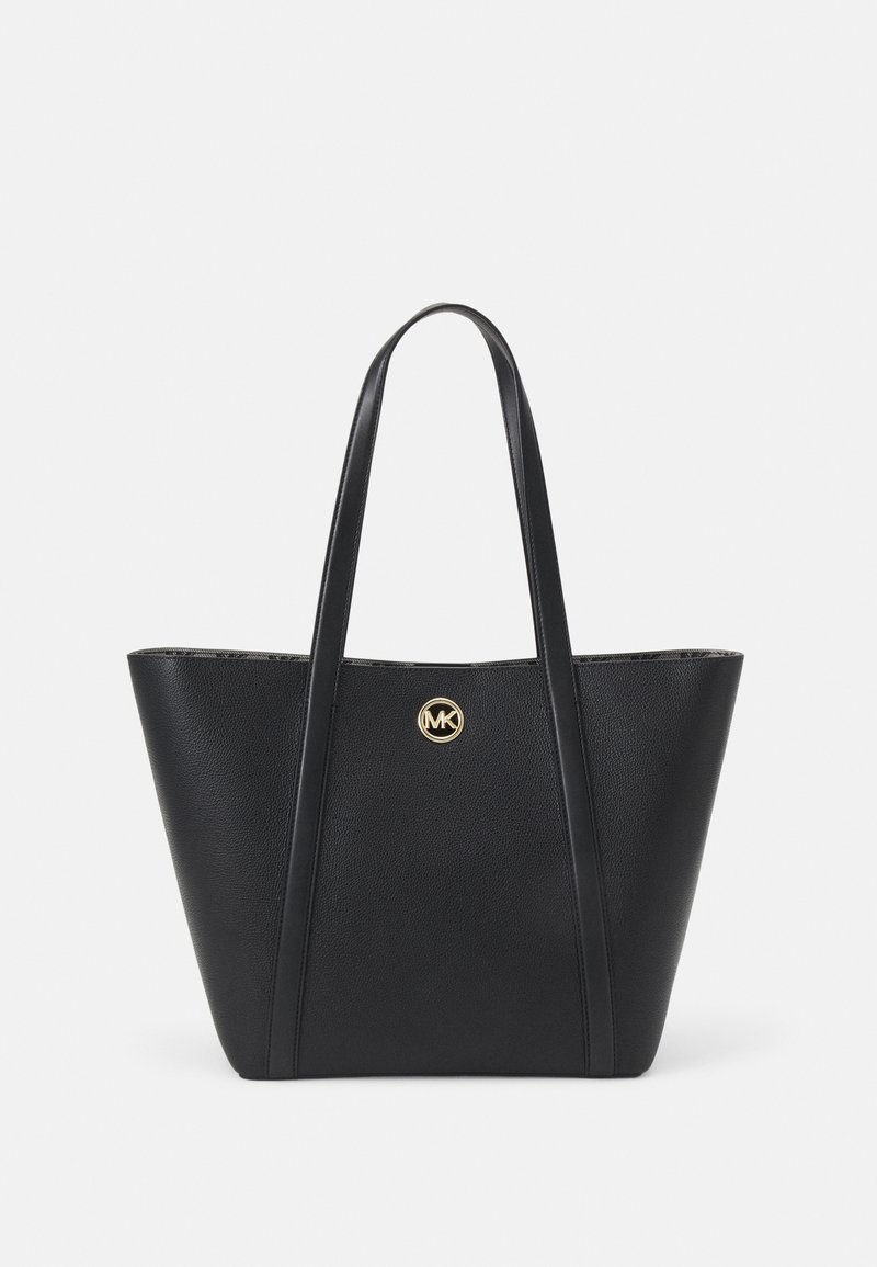 Sac cabas en cuir noir avec deux longues anses et un petit logo circulaire doré MK centré à l'avant.