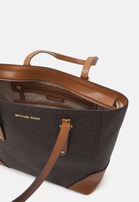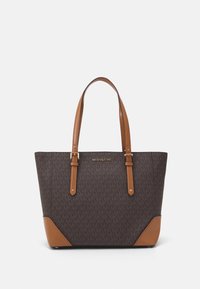 Sac cabas marron avec un motif texturé, des accents en cuir beige, deux poignées et un logo. Le sac a un design structuré et est spacieux.