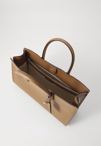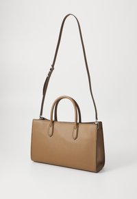 Sac à main en cuir fauve avec deux anses, une bandoulière amovible, et une texture granuleuse, orné d'un petit porte-bonheur et d'un détail logo.