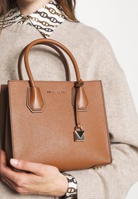 Femme portant un pull beige par-dessus une chemise à motifs, un jean bleu, des talons blancs, tenant un sac à main en cuir marron sur fond blanc.