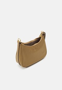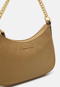 Sac à main en nylon beige avec un design courbé, une bandoulière en chaîne dorée, une fermeture éclair et un logo embossé sur le devant.