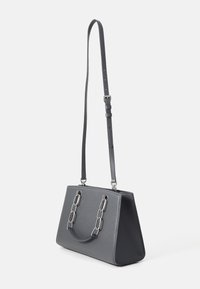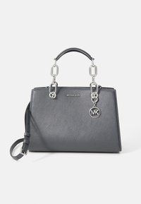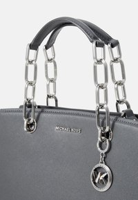 Sac à main synthétique gris à texture lisse, ferrures argentées, double poignées supérieures, bandoulière amovible et pendentif avec logo MK bien en évidence.