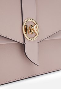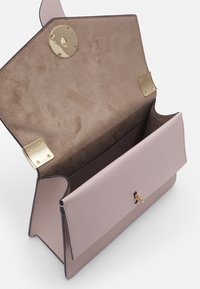 Sac à main structuré rose clair avec un design plat, des éléments métalliques dorés et un rabat pliable. Comprend une sangle amovible et un accent logo.