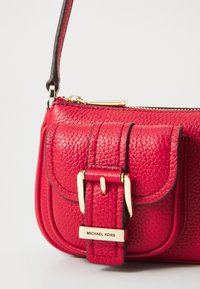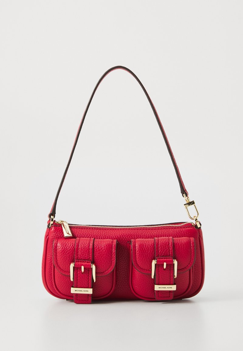 Sac bandoulière en cuir rouge avec deux poches avant à boucles et une fermeture éclair dorée, doté d'une bandoulière assortie rouge avec des ferrures dorées.