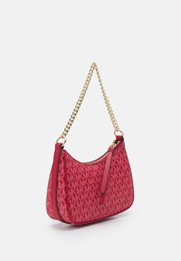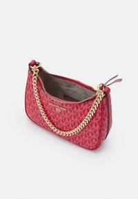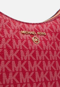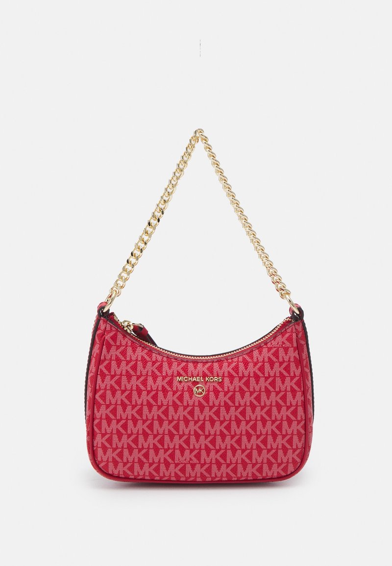 Sac à main Michael Kors rouge avec bandoulière chaîne dorée, fermeture zippée et motif répété du logo MK.