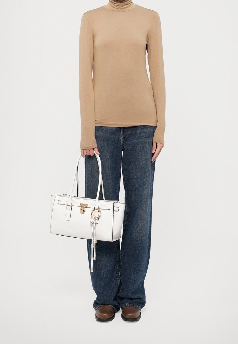Haut à col roulé beige, jean large bleu foncé, chaussures marron et sac à main blanc avec quincaillerie dorée tenu par une personne.