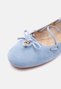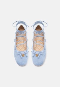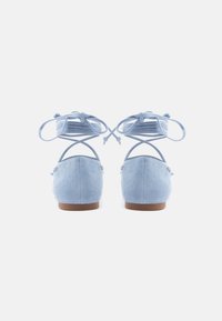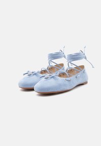 Ballerine plate en daim bleu clair avec des lanières à lacets qui s’enroulent autour de la cheville et un petit nœud sur le bout.