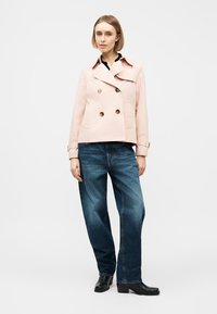 Femme portant une veste croisée rose clair avec des boutons marron et un jean bleu, devant un fond clair uni.