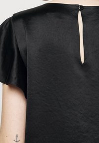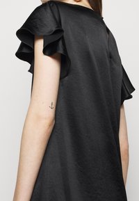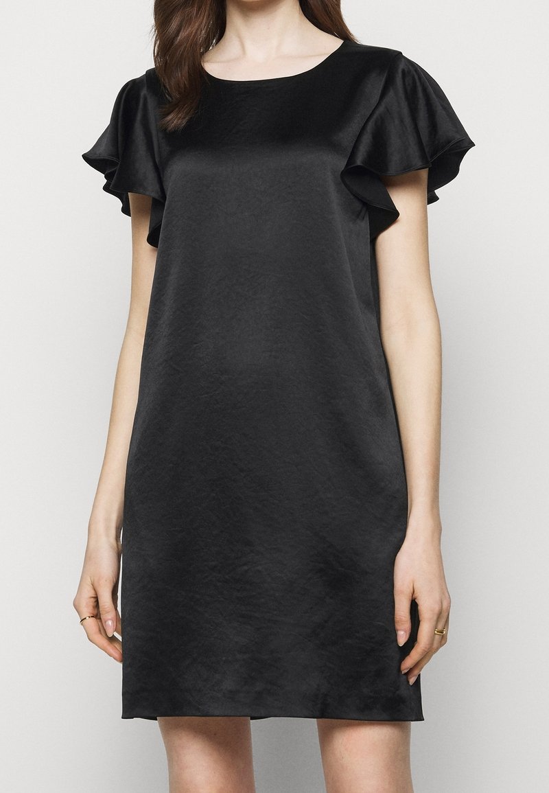 Robe en satin noir avec de courtes manches volantées et un col rond. Le tissu a une texture lisse et tombe au-dessus des genoux.