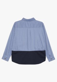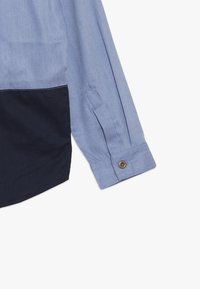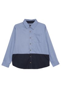 Chemise à manches longues boutonnée, avec la partie supérieure en bleu clair et la partie inférieure en bleu foncé. Dotée d'un col, d'une poche avant et d'un ourlet arrondi.