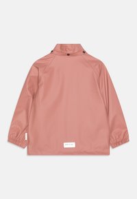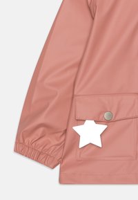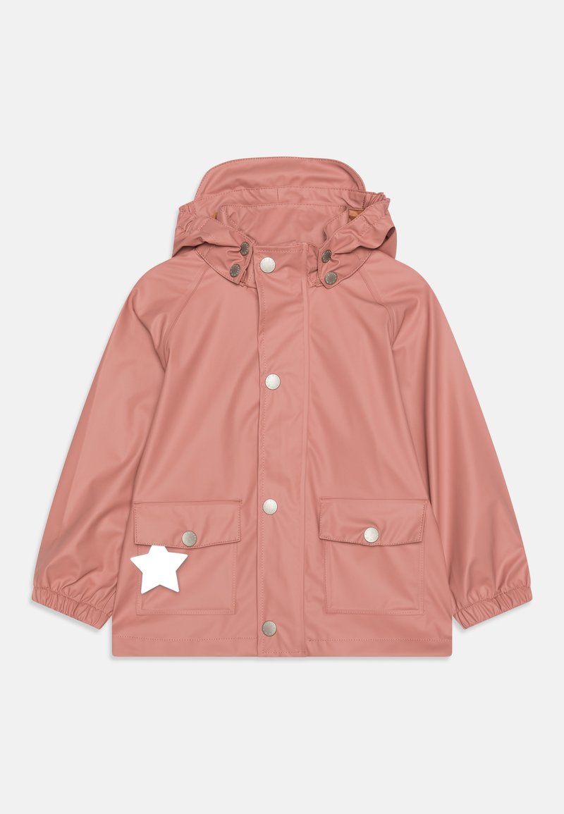 Veste imperméable rose poudré pour enfants avec capuche, fermetures à boutons-pression, deux poches à rabat à l'avant et poignets élastiqués.