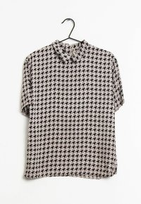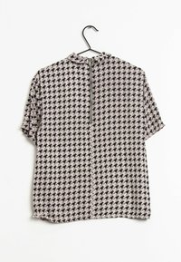 Blouse à manches courtes avec motif pied-de-poule noir et beige, col montant court, suspendue à un cintre noir sur fond blanc.