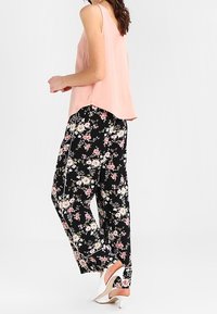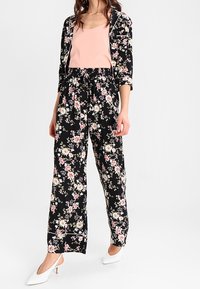 Débardeur rose blush à fines bretelles, avec une coupe ample et une poche latérale ; associé à un bas noir à imprimé floral. Texture douce.