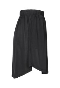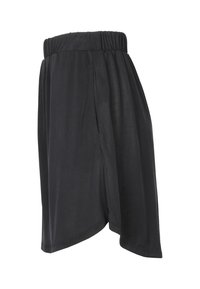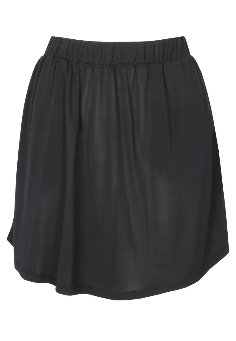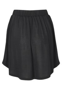 Jupe noire mi-genou en ligne A avec taille élastique et tissu doux légèrement froncé.