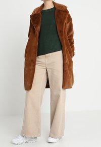 Femme portant un long manteau en fausse fourrure marron par-dessus un pull côtelé vert foncé et un pantalon beige clair, tenant le manteau ouvert d'une main.