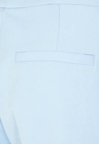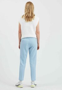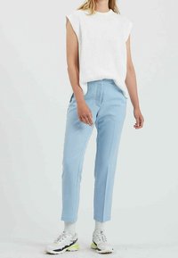 Pantalon bleu clair sur mesure avec une texture lisse, présentant un pli à l'avant et une jambe fuselée. Porté avec un haut blanc sans manches et des baskets.
