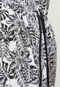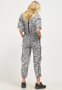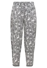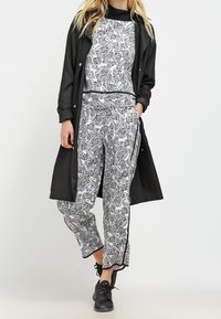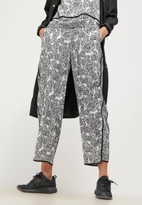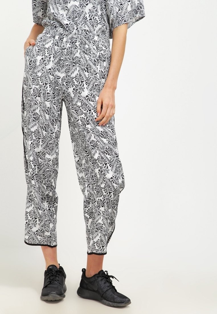 Femme portant un pantalon noir et blanc à motif de feuilles et des baskets noires, debout avec une main dans la poche sur un fond uni.
