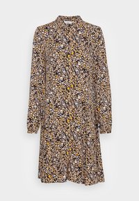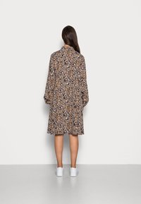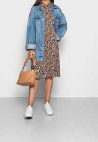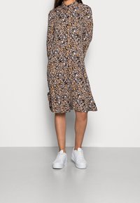 Robe à motifs floraux en noir, marron et orange, avec des manches longues et un col montant. Accordée avec des baskets blanches.