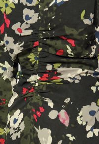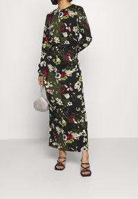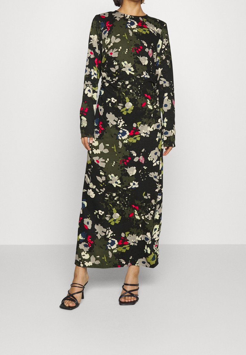 Femme portant une robe longue à manches longues, de couleur vert foncé, longue jusqu'aux chevilles, avec un imprimé floral multicolore, et des sandales noires à talons hauts avec des lanières.