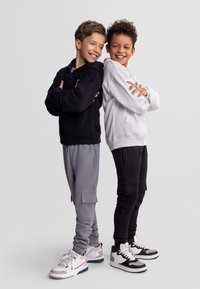 Deux garçons souriants, l'un portant un sweat à capuche noir et un pantalon cargo gris, l'autre un sweat à capuche blanc et un pantalon cargo noir, se tenant côte à côte.