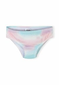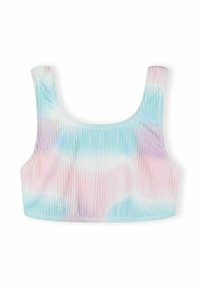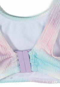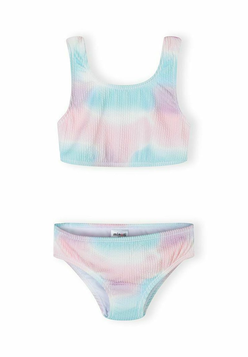 Maillot de bain deux pièces avec motif tie-dye pastel en rose, bleu et violet, comprenant un crop top sans manches et un bas style slip.