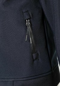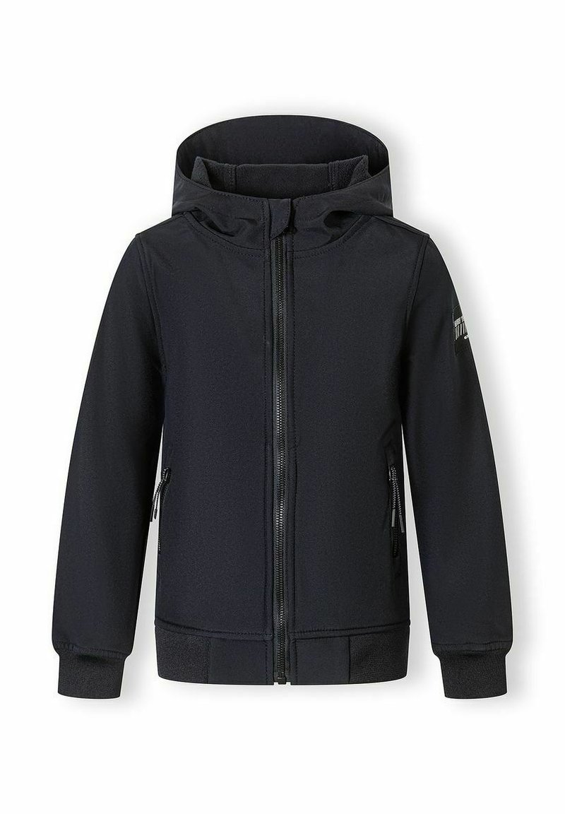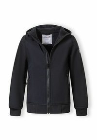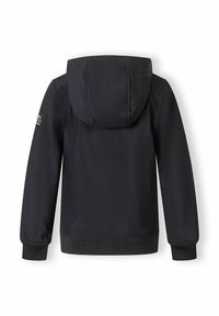 Veste noire à capuche avec fermeture éclair, poignets côtelés, poches latérales zippées et petit logo sur la manche gauche, présentée sur fond blanc.