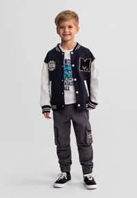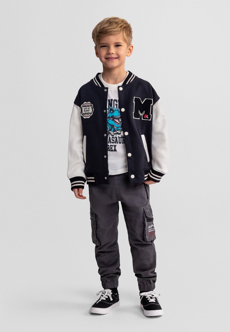 Jeune garçon portant une veste universitaire noire et blanche, un t-shirt avec un motif de dinosaure, un pantalon cargo gris et des baskets noires, debout et souriant.