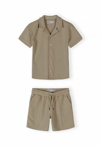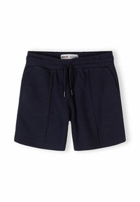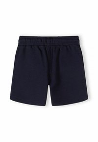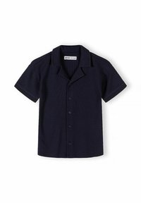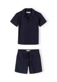 Jeune garçon aux cheveux clairs portant une chemise à manches courtes bleu marine avec boutons et un short assorti, debout devant un fond clair uni.