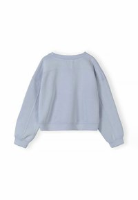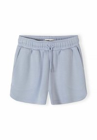 Jeune fille aux longs cheveux portant un sweat-shirt lavande, un short assorti, des chaussettes rayées et des baskets lavande, debout devant un fond uni.