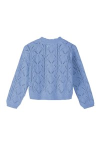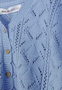 Cardigan tricoté bleu clair avec manches longues, boutonnage avant et motif ajouré en losanges.