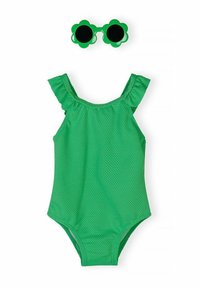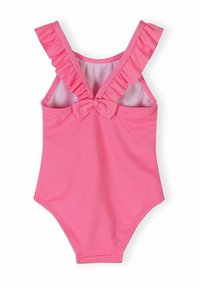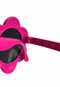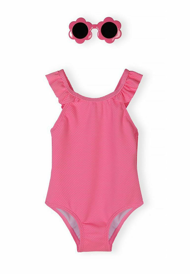 Maillot de bain une pièce texturé rose avec bretelles à volants et lunettes de soleil roses en forme de fleur avec verres noirs au-dessus.